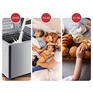 ♦15h Timer, 15-minutige Stromausfallwiederaufnahme, 1h Warmhalte, ermöglichen es Ihnen, das gewünschte Programm im Voraus und jeden Morgen frisches und warmes Brot zu genießen