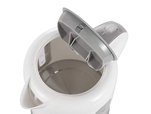 Unter dem weißen Gehäuse verbirgt sie das Edelstahl-Heizelement. LED-Kontrollleuchte informiert, wenn das Wasser zum Kochen gebracht wird.
