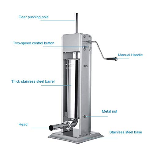 Einfach zu bedienen: Die Wurstmaschine ist einfach zu bedienen und einzurichten. Unterstützen Sie sie einfach an der Kante des Tisches oder der Konsole. Anschließend können Sie durch Drehen des Griffs problemlos Würste herstellen.Es gibt zwei Geschwindigkeitsanpassungsmethoden für den manuellen Griff. Sie können die gewünschte Geschwindigkeit abkommandieren.Bei der Herstellung von Würstchen wird empfohlen, eine kleine Absolutbetrag Speiseöl hinzuzufügen, um die Reiben zu verkleinern.Vermeiden Sie das Heraus