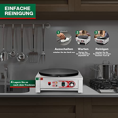 🥞 KOMBI AUS ROBUSTHEIT UND BEQUEMLICHKEIT: Der Körper von diesem CE zertifiziertem Crepes Maker besteht aus Edelstahl, der pflegeleicht und gleichzeitig widerstandsfähig. So lässt das Gehäuse sich einfach mit den mitgeliefern Tüchern säubern. Die Antihaftbeschichtung ermöglicht, dass Speisen einfach gewendet oder entnommen werden können und Speisereste sich kinderleicht separieren lassen. Die herausstreckede Frontplattendesign verhüten effektiv auch, dass Ölreste zum Bedienfeld fließen.