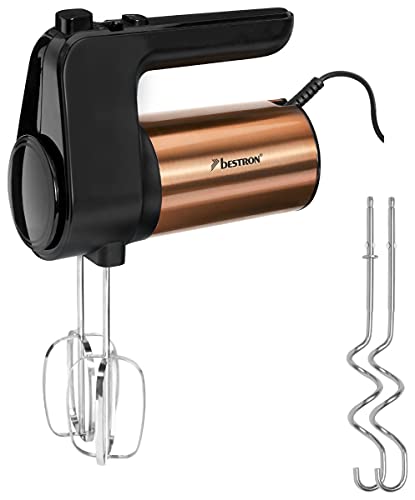 Lieferumfang: 1 Bestron Power Handmixer, Inkl. 2 Schneebesen & Knethaken, Copper Collection, Leistung: 400 Watt, Maße: 18x16x8 cm, Gewicht: 1 kg, Material: Kunststoff/Edelstahl, Farbe: Schwarz/Kupfer, AHM1000CO