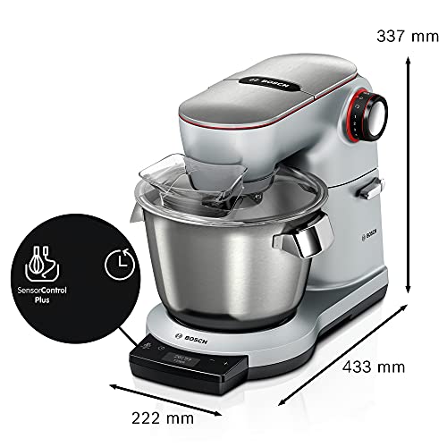 Bosch Küchenmaschine Serie 8 MUM9DT5S41, Edelstahl-Schüssel 5,5 L, integrierter Timer, ohne Waage, diverses Zubehör, Planetenrührwerk, Profi-Knethaken, Schlag-, Silikonbesen Edelstahl, 1600 W, silber