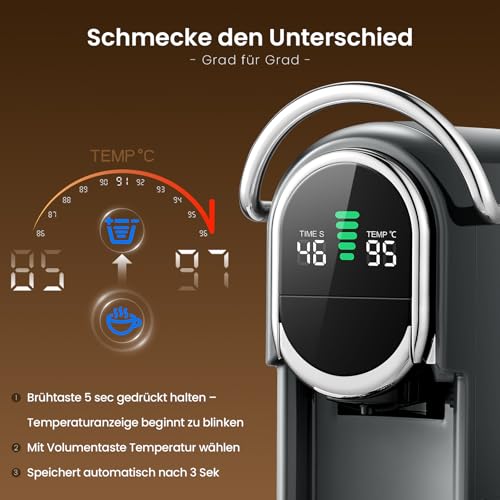 Totale Personalisierung des Kaffees: Personalisierte Temperatureinstellung zwischen 85 °C und 97 °C und 7 Stufen der Auswahl des Wasservolumens, um Ristretto, Espresso, Lungo, Cappuccino zuzubereiten und die Bedürfnisse des Double Espresso mit gemahlenem Kaffee zu erfüllen. Das LED-Display mit Hintergrundbeleuchtung zeigt Temperatur, Wasservolumen und Zeit an und bietet ein WYSIWYG (What You See Is What You Get) Erlebnis für Ihren Lieblingskaffee