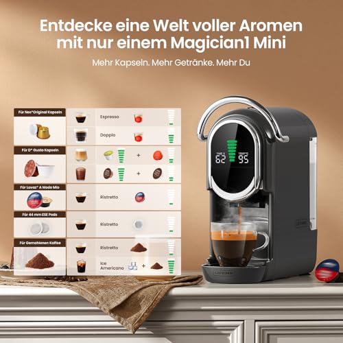 5-in-1-Kaffeemaschinen: Die vielseitige Mini-Kaffeemaschine Magician1 Mini Espresso ist kompatibel mit Nespresso* Original (OL), Dolce Gusto*, Lavazza* A Modo Mio Kapseln, ESE 44 mm pads und gemahlenem Kaffee, bietet eine hohe Flexibilität. Von Espresso bis Cappuccino, holen Sie sich alle Ihre Lieblingsgetränke mit nur einem Gerät, ohne dass Sie mehrere Maschinen benötigen