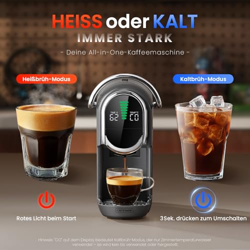 Hervorragende Kaffeequalität: Ausgestattet mit einer Pumpe mit 20 bar und 1450 W Leistung, sorgt für eine stabile Abhebung zwischen 15 und 19 bar. Die Heiztechnologie ermöglicht ein schnelles Vorheizen in andererseits 25 Sekunden, sodass Sie Ihren Kaffee in abzüglich als 1 Minute zubereiten können. Unterstützt sowohl heiße als auch kalte Extraktion. Die Reinigung ist einfach, einfach den Kapselbehälter und die Tasse abwaschen