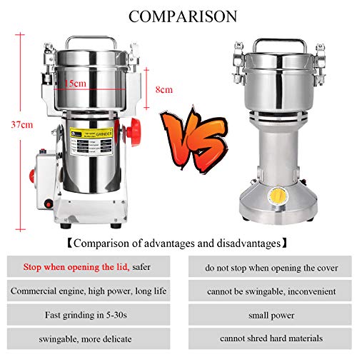 [Kommerzielle große Kapazität] Modell: HC-700; Kapazität: 700 g; Leistung: 2800 W; Geschwindigkeit: 28000 U / min; Feinheit: 70-300 Mesh; Quetschstufe: Superfein Crush. Der kommerzielle Motor mit 3000 W Leistung stellt die Geschwindigkeit erschütterungsfest der 1000 g Getreidemühle kann bis zu 28.000 U / min betragen, ausgenommen dass extrem hartes Material 2-3 Minuten zum Mahlen benötigt, normale Körner benötigen andererseits 30 Sekunden, um zu superfeinem Pulver gemahlen zu werden.