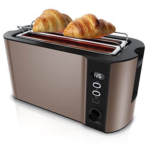 Doppelter selbsteinstellender Toaster mit 2 Schlitzen von 3,5 cm Breite mit automatischen Einstellungen, wodurch er sowohl für Waffeln, Muffins, Bagel usw. im Rahmen ist und die Brote immer in der besten Bräunungsposition gehalten werden kann, um Ihren täglichen Toastbedarf gerecht zu werden.