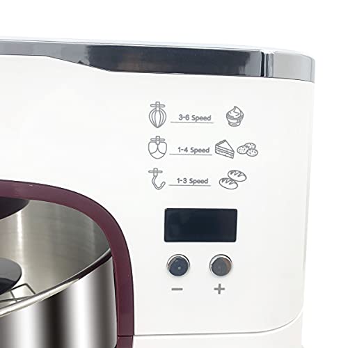 Multischutz: Der Teigkneter ist mit Lüftungsöffnungen zur Wärmeableitung ausgestattet. 110-Stufung-Motortemperaturüberwachungsschutz, Maschinenkopf-Hebeschutz, automatischer Abschaltschutz, Motorblockierschutz. Sichtbarer Spritzschutz: Verhindert Spritzer beim Mischen. Der Spritzschutz mit Zugangsklappe hilft, Zutaten hinzuzufügen, ohne etwas zu verschmutzen. Multi-Saugnäpfe an der Unterseite der Teigmaschine haftet fest auf dem Desktop, um ein versehentliches Herunterfallen zu verhüten.