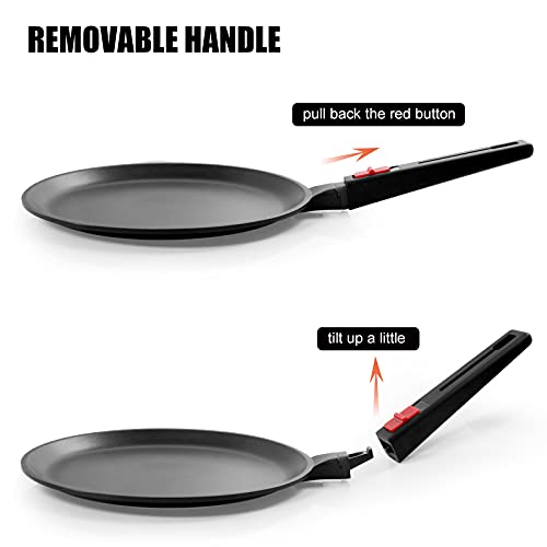 INDUKTIONSBASIS: Brauchbar für verschiedenen Arten von Öfen, einschließlich Gas, Elektrik, Keramik und Halogen. Die abnehmbare Pfannkuchenpfanne kann im Ofen verwendet werden, die Temperatur muss andererseits unter 230 Nuance Celsius liegen. (**Hinweis: Der Griff kann nicht in den Ofen gestellt werden, bitte keinen Finger krumm machen Sie zuerst den Griff.)