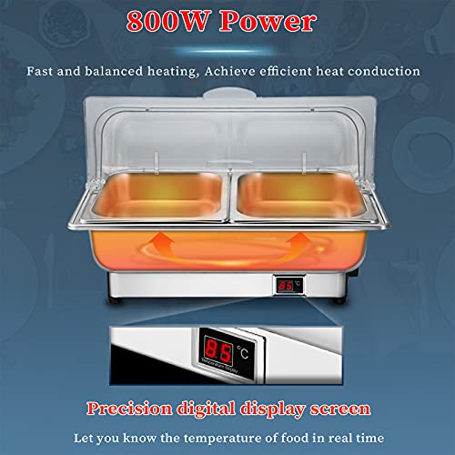 [Präzise Temperaturregelung mit digitaler Anzeige]: Unser Buffetwärmer verfügt über 800 W Superleistung, die gleichmäßig und schnell aufheizen kann, um eine hocheffiziente Wärmeleitung zu erreichen. Unten befindet sich ein digitales Display, um die Temperatur in Echtzeit zu nachprüfen, um den Geschmack der Speisen zu gewährleisten.