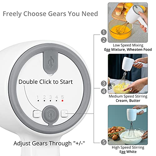 Der elektrische Handmixer mit multifunktionaler Drehzahlregelung erfüllt Ihre unterschiedlichen Grundbedürfnisse beim Backen. Doppelklicken Sie schnell auf den Schalter, um ihn ein- oder auszuschalten, und drücken Sie als Folge „+“ oder „-„, um 5 Geschwindigkeiten zu steuern.