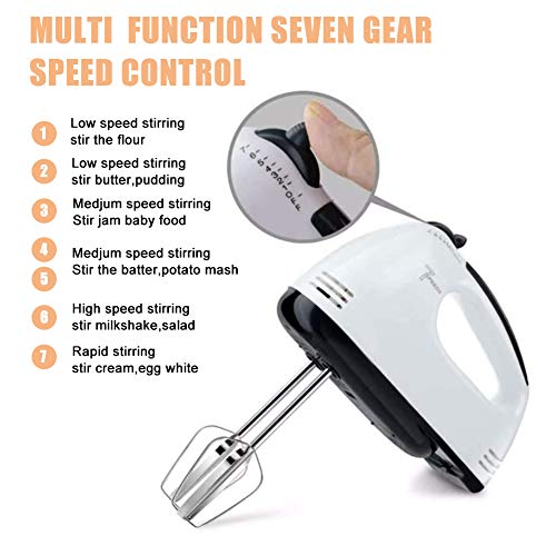 7 Geschwindigkeitsoptionen: Der Handmixer mit 7 Geschwindigkeiten erfüllt alle Ihre Mischbedürfnisse. Langsamer Start, eine Nullgeschwindigkeit gibt Ihnen reibungslosen und problemlosen Start Alle Einstellungen sind mit dem Daumen bedient, was bedeutet, dass der elektrische Handmixer sehr einfach zu bedienen ist. ErmÃglichen Sie hochwertige Ergebnisse vom Umrühren von trockenem Mehl, Marmelade, weichem Teig bis hin zum Rühren von Mashed.