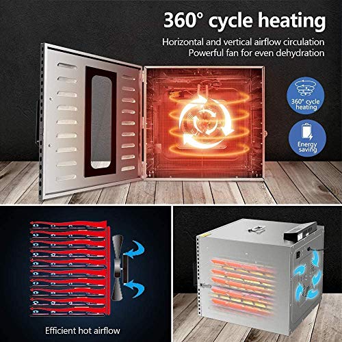 GROSSE KAPAZITÄT – 10 Tabletts und 1 Tropfschale, unser 304 Edelstahl-Dörrgerät bietet ausreichend Platz, um alle Arten von Gemüse, Obst, Kräutern, Fleisch, Fisch und Garnelen, Brot, Pilzen und anderen schnell und einfach zu Abreiben. Es kann die Mineralien und Vitamine in Lebensmitteln binden, nahrhafter halten.