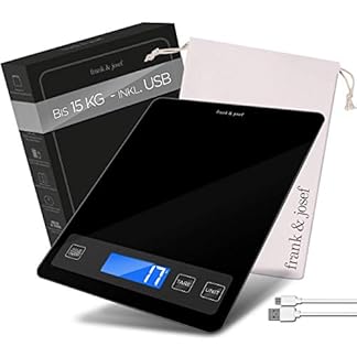 frank & josef Küchenwaage Digital mit Akku I 1g Genau – 15kg Max. Belastung I Digitale Küchenwaage mit Tara & Hold…