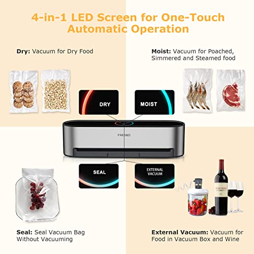 Der FRESKO V8 vakuumierer kombiniert fünf Arten von Versiegelungsfunktionen: Trockensauger, Feuchtvakuum, Versiegelung, Vakuumsaugkanister, Weinstopfen, macht alles in Ihrem Leben gut organisiert.