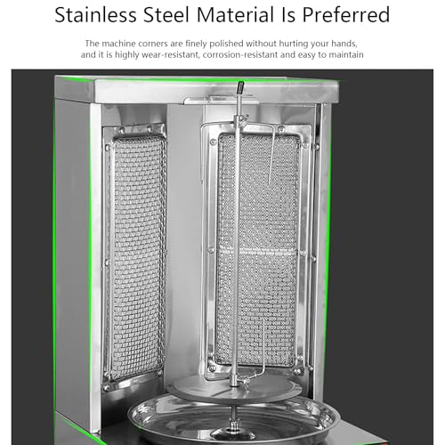 【Gleichmäßige und stabile Shawarma-Maschine】Der Fleischgriller ist aus sicherem und lebensmittelechtem Edelstahl gefertigt. Die Maschine verwendet hochwertige Brenner und einen Rotationsstab, das Backnetz hat ein Wabendesign, um eine gleichmäßigere und stabilere Erhitzung zu gewährleisten. So werden die Speisen köstlich und gesund. Diese vertikale Shawarma-Maschine hat einen geringen Abnützung bei hoher Effizienz.