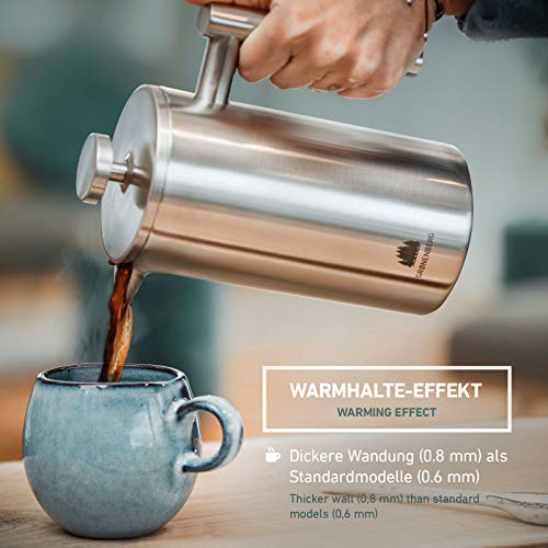 WARMHALTE-EFFEKT: Wir nutzen bei unserer French Press ein dickere Wandung (0.8mm) als Standardmodelle (0.6mm), wodurch dein Kaffee noch mind. 1 Stunde warm bleibt.