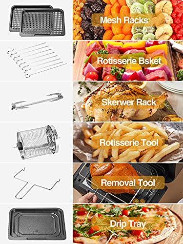 【Reiches Zubehör】 mit den 6 Zubehörteilen: 1x Rotisseriekorb, 1x Entnahmewerkzeug, 1x Netzgestelle, 1x Tropfschale, 8x Spieße, 1x Rotisserie-Schaft, 1x Rezepte. Abnehmbare Tropfschalen und spülmaschinenfeste Teile machen die Reinigung zum Kinderspiel. 2 Jahre Ersatzservice und 24 Stunden Kundendienst statt Ihnen, ohne Sorge zu kaufen. Wir andienen Ihnen ein englisches Rezept im PDF-Form an