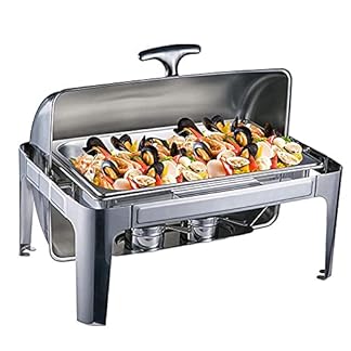 9L Edelstahl Full Size Roll Top Chafing Dish Hochwertiger rechteckiger Clamshell-Buffetkocher mit Pfannenbrennerhalter Der runde Chafer kombiniert ein attraktives Design mit wirtschaftlichem Wert und hält und wärmt Ihre Speisen. Das erhöhte Regal positioniert die Hitze in der Nähe der Wasserpfanne und hält die perfekte Serviertemperatur Ihrer Speisen stundenlang aufrecht. Es ist perfekt für jeden Anlass, wie Hochzeiten, Partys, Brunches, Hotelfrühstücksbereiche, Bankette, Catering-Events und Selbstbedienungsumgebungen. Dieser Chafer enthält sowohl eine Wasserschale in voller Größe als bekannt als eine Lebensmittelschale, die perfekt in den Rahmen passen und sofort verwendet werden können.