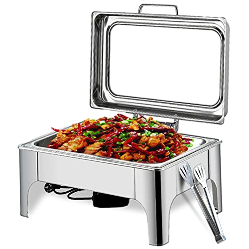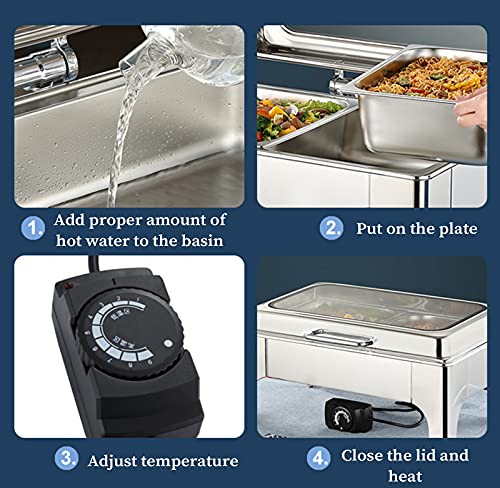 [Sichtbarer Glasdeckel]: Der Deckel des Elektrisch Chafing Dish verfügt über einen hydraulischen Schaft, der sich reibungslos öffnet und schließt, sodass Sie Lebensmittel leichter entnehmen und platzieren können. Gleichzeitig können Sie durch den sichtbaren Glasdeckel die innere Speisensituation beobachten, ohne den Deckel zu öffnen, die Speisensituation in Echtzeit erfassen und sicherstellen, dass die Speisen köstlich sind
