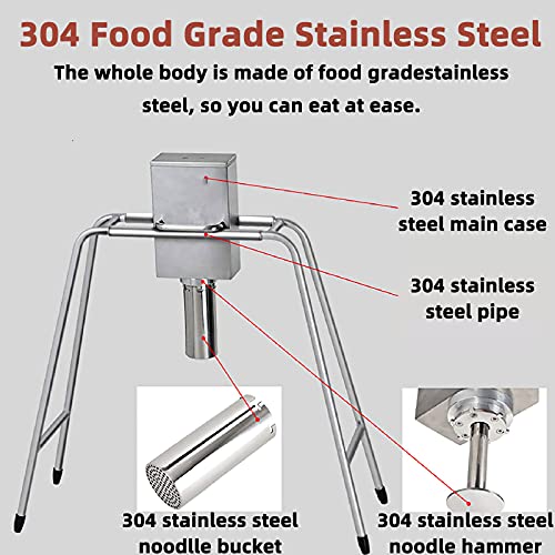 Der Nudelpresser ist eine tragbare und einfach zu bedienende Nudelmaschine. Wir stellen Ihnen 4 Arten von Nudeleimern zur Verfügung. 1,7 Pfund Nudeln können in einer Minute ausgepresst werden. Die Pressgeschwindigkeit ist ausgesprochen schnell und die Effizienz ist hoch. Die Kabine ist freihändig und der Schub von 400 kg sorgt dafür, dass die Nudeln fest, mobil, glatt, nicht klebrig und schwer zu verkochen sind. Der Nudeleimer, der Nudelhammer und die Teleskopstange, die direkt mit den Nudeln in Kontakt kommen, bestehen aufgebraucht leer lebensmittelechtem Edelstahl 304, so dass sie gesund, gefestigt und langlebig sind.