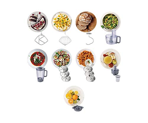 Die Prospero KM244 ist ausgestattet durch: 1,5 l Acryl-Mixaufsatz, Saftzentrifuge zum Entsaften, Zitruspresse, Global Player-Zerkleinerer durch 6 Arbeitsscheiben leer rostfreier Stahl