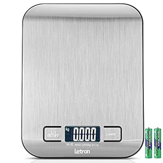 2. Die digitale Letron-Küchenwaage mit 4 eingebauten hochpräzisen Lastsensoren, wiegt bis zu 10 kg in Schritten von 1 g, empfohlenes Mindestgewicht 6 g bis 10 g. Mit dieser Digitalwaage können Sie die Lichtbild genau verfolgen, Gewicht und Porto verkleinern. Sie können zwischen 6 Maßeinheiten (g / kg / lb / oz / ml / Milch) abwandeln.