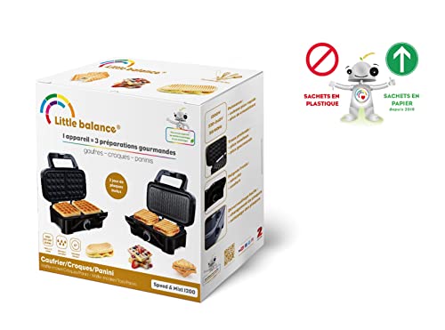 Waffeleisen Speed’n Mixt 1200 von Little Balance für Waffeln, Paniniis, Grillen, jeglicher einfach selbstgemachten – 2 Sets herausnehmbare Platten – antihaftbeschichtet – Waffeleisen, Sandwich, Paninis, Grillades… – Leistungsstarkes und schnelles Antrieb: Vorheizen in 5 Minuten / Leistung 1200 W – 2 Kontrollleuchten: Betriebsanzeige u. 1 Kontrollleuchte „gebrauchsfertig“ – Thermostat verstellbar 5 Positionen – rutschfeste Füße umgehen ein Herunterfallen – Platten spülmaschinenfest – kompaktes rechteckiges Design – Garantie in Frankreich – Bedienungsanleitung in französischer Sprache