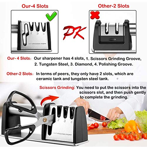 4-stufiger manueller Schärfer: Dreistufiger Schärfvorgang (insensibel, mittel, fein) Sie können jedes Messer je nach Verschleißgrad superscharf machen. Der erste Schlitz ist für eine Schere. Die Schlitze 2,3,4 dienen dann zum Grobschleifen, Feinschleifen und Abschleifen. Es ist eine feine Schneide, um jede Klinge von stumpf bis gestochen scharf zu machen.