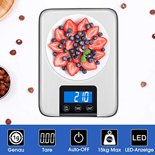 【Genaue Messung】 Die digitale Küchenwaage mit 5 eingebauten hochpräzisen Lastsensoren,Einheitenumrechnung (Gramm, Unzen, Pfund, Kilogramm und Milliliter), schnelle und genaue Handlung bis 1 g beim Zusammenrechnen von Zutaten, Messbereich: 2 g bis 15 kg.