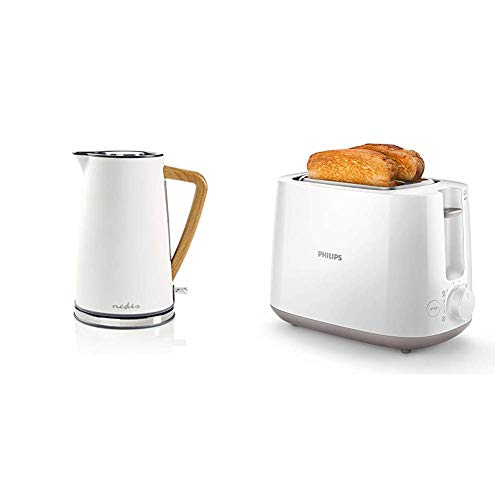 Dieser elegante, leistungsstarke elektrische Wasserkocher von Nedis funktioniert genauso gut wie er aussieht: Er bietet ein großzügiges Fassungsvermögen von 1,7 Litern, bringt Wasser schnell zum Kochen und ist so konzipiert, dass Kalkablagerungen minimiert werden. Mit einem Look aus Edelstahl, Holz und Gummi ist unser Wasserkocher eine elegante, strapazierfähige und leicht zu reinigende Ergänzung für Ihre Küche. Er ist so ausgelegt, dass er bei jedem Gebrauch ausreichend Wasser für sechs bis acht Tassen erhitzt. Zwar dürfte niemand zu lange auf seinen Tee oder Kaffee warten. Der kabellose 360°-Drehsockel ermöglicht ein einfaches Abebben und der ergonomisch geformte Wasserkocher ist bequem zu handhaben, selbst wenn er gefüllt ist. Das verdeckte 2200-W-Heizelement und der herausnehmbare Filter sorgen dafür, dass Ihr Wasser schnell zum Kochen gebracht und Kalkbildung minimiert wird.