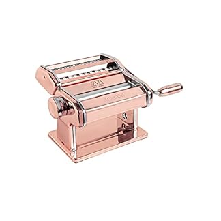Mit der Atlas 150 können Sie leicht Lasagne (max. Breite 150 mm), Bandnudeln (6 mm) und Tagliolini (1,5 mm) kreieren. Die Farbe entsteht durch eine Kupferablagerung, gefolgt von einer Oberflächenbehandlung zum Abschirmung der Farbe, dadurch wird das für Kupfer typische Anlaufen, vermieden. Die Walzen sind aus anodisiertem Aluminium, die Kämme und die Schaber sind aus Polymerharz, damit es sichergestellt wird, dass keine schädliche Pulverteile mit dem Teig in Kontakt kommen. Der Regler für die Annullierung der Teigdichte hat 10 Spezifizieren. Die Kämme, unterhalb der Schneidewalzen können entfernt werden: das Anlage kann mit einem Pinsel leicht gereinigt werden, damit eventuelle Restmehlpartikeln entfernt werden können. Die Nudelnmaschine darf absolut nie mit Wasser oder in der Geschirrspüler gereinigt werden. Unter Berücksichtigung des kontinuierlichen Verbesserungsverfahrens, kann das Produkt von den Bildern abschweifen.