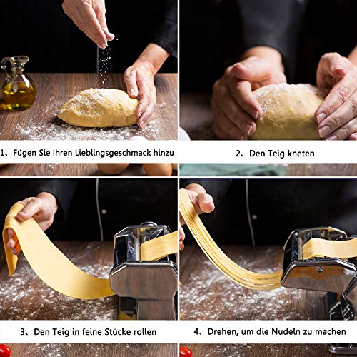 【Schnelles Erstellen von Luxuriösen Schönen Nudeln】Diese Pastamaschine vereinfacht den Fortschritt der Nudelherstellung, indem Sie die Kurbel mit der Hand drehen, damit die Walzen die Nudeln pressen, anstatt auf die traditionelle Art und Weise. Sie können bequem die köstlichen Lebensmittel mit perfekten frischen Geschmack und Textur öfter mit Hilfe dieser handelsüblichen Ausrüstung, einschließlich Fettuccine, Lasagne, Linguine, Spaghetti, Engelshaar,usw.