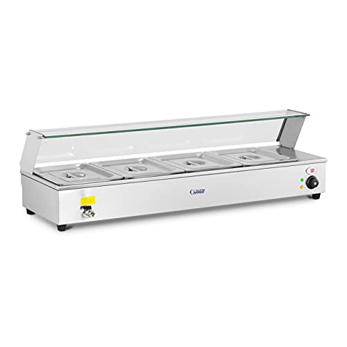 Kontrollleuchten informieren über den jeweiligen Betriebsstatus; die Temperatur kann zudem bequem vom großen, digitalen Display abgelesen. Dank der Edelstahllegierung sind Behälter denn Deckel spülmaschinenfest. Der Bain Marie Speisenwärmer verfügt über einen Glasschutz nicht mehr da Sicherheitsglas, der je nach Bedarf mit wenigen Handgriffen montiert oder abermals entfernt werden kann.