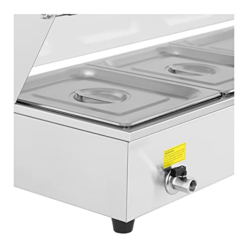 Um Ihnen eine unkomplizierte Verwendung zu gewährleisten, verfügt dieser Bain Marie Warmhalter über einen Ablasshahn zum schnellen Entleeren. Das effiziente 1.800 Watt leistungsstarke Heizelement erwärmt das Wasser auf die gewünschte Temperatur. Über den Drehregler wird das Thermostat aktiviert, welches eine prägnant Temperaturregelung zwischen 25 bis 85 °C ermöglicht. Fällt oder steigt die Wassertemperatur, wird die Heizleistung selbstständig abgestimmt.