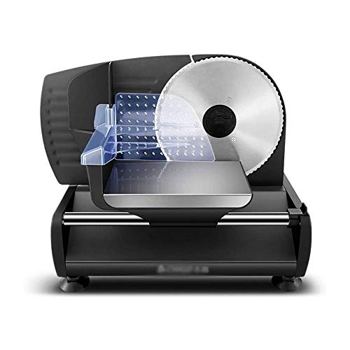 Der 320 W starke Elektromotor sorgt für eine Drehzahl von 426 U/min und verspricht ein außerordentlich schnelles und präzises Schneideergebnis. Aufgrund dieser satten Leistung gleitet die scharfe Rundklinge mit einem Durchmesser von 250 mm selbst durch Hartkäse denn durch Butter. Die Schnittdicke der Wurstschneidemaschine ist per Drehknopf mit Skala stufenlos von 0 bis 12 mm regulierbar. Der schützende Lebensmittelschieber und die geprägte Oberfläche verhüten zumal ein Verrutschen des Produktes.