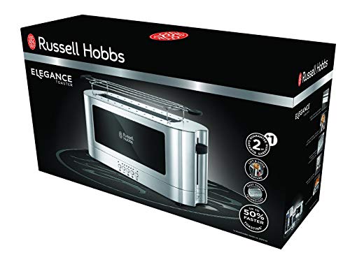 Lieferumfang: 1x Russell Hobbs Langschlitz Toaster mit Bedienungsanleitung / Automatische Brotzentrierung an Stelle gleichmäßige Bräunung / Hochwertiger, polierter Edelstahl mit Glasapplikationen