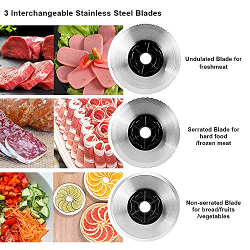 3 VERSCHIEDENE KLINGEN – Dieser elektrische Fleischsilcer ist mit 3 Edelstahlklingen ausgestattet, um alle Ihre Anforderungen zu erfüllen. Gezackte Klinge für hartes Essen / gefrorenes Fleisch, gewellte Klinge für frisches Fleisch, nicht gezackte Klinge für Brot, Obst und Gemüse.
