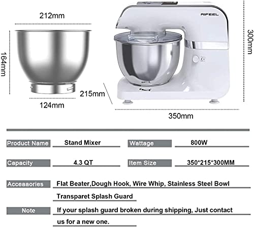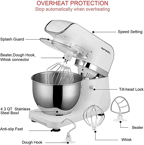 Aifeel Stand Mixer equipped with dough hook, beater, whisk, 4.5L stainless steel bowl. It can meet your various cooking needs. The splash guard helps avoid spattering when mixing and adding ingredients, keeping your kitchen tidy. Anti slip feet keep the stand mixer steady while it is working. Overload and overheated protection system make sure safety use.