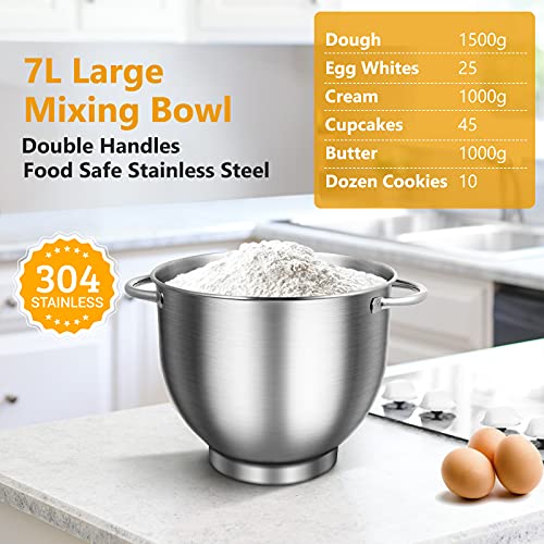 🍞 【7L Große Rührschüssel】: Diese Küchenmaschine mit Rührschüssel aus lebensmittelechtem Edelstahl (Nr. 304) kann problemlos die Kochbedürfnisse von 4-8 Personen in der Familie erfüllen. Bis zu 1500 g Teig schonend mischen, um Ihren Bedarf an Sahne, Teig, Baiser, cremigen Gewürzen und Backwaren aller Art zu decken.