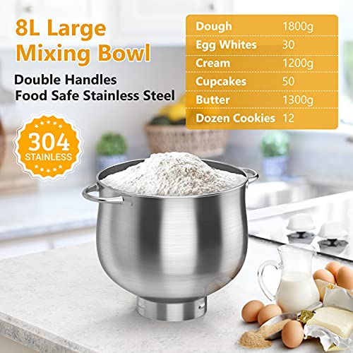 🍞 【8L Große Rührschüssel】: Diese Küchenmaschine mit Rührschüssel aus lebensmittelechtem Edelstahl (Nr. 304) kann problemlos die Kochbedürfnisse von 4-9 Personen in der Familie erfüllen. Bis zu 1800 g Teig schonend mischen, um Ihren Bedarf an Sahne, Teig, Baiser, cremigen Gewürzen und Backwaren aller Art zu decken.