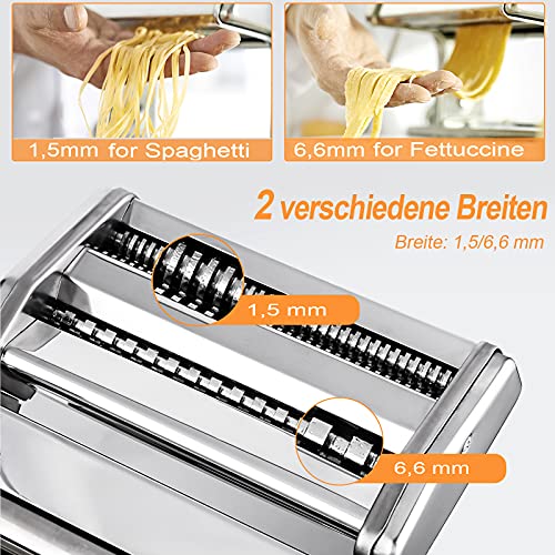 【2 BREITEN FÜR HAUSGEMACHTE NUDELN】Diese manuelle Nudelmaschine verfügt über einen Doppelschneider-Aufsatz – 1,5 oder 6,6 mm für verschiedene Nudelbreiten. Perfekt für die Zubereitung frischer Lasagne, Spaghetti, Engelshaar, Ravioli, Knödel, Pizza, Fettuccine, Tagliatelle, Linguine, Fadennudeln usw. Es erfüllt alle Ihre Bedürfnisse bei der Nudelherstellung.