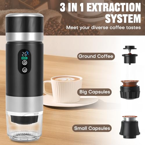 3-in-1 Espressomaschine: Entwickelt, um alle Ihre Kaffee-Bedürfnisse zu zu Ende führen, ist sie kompatibel mit gemahlenem Kaffee, kleinen und großen Kapseln. Ideal für Reisen, Wandern oder unterwegs – genießen Sie perfekten Kaffee, egal wo Sie sind.