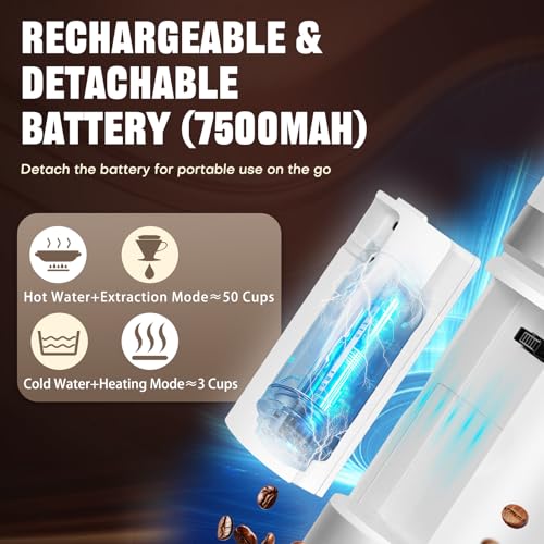 Wiederaufladbarer Akku mit 7500 mAh: Ausgestattet mit einem abnehmbaren 7500 mAh Akku, ist die Maschine leichter und einfacher zu verstreben. Eine Ladung ermöglicht 3-4 Extraktion kalt oder bis zu 50 heiß. Es wird empfohlen, nach Möglichkeit vorgewärmtes Wasser für die Extraktion zu verwenden – dies verkürzt die Zubereitungszeit erheblich und erhöht die Anzahl der Tassen.
