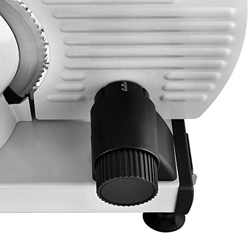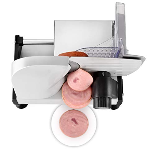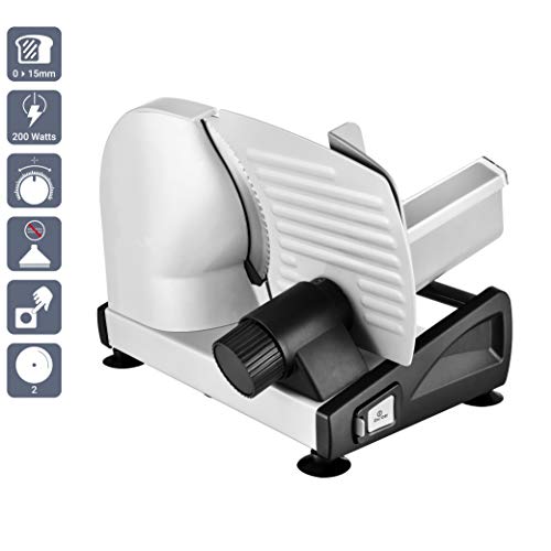ROBUSTER ALLESSCHNEIDER mit 200 W Leistung, Gehäuse aus Stahl, 2 Messer aus Edelstahl mit 0 bis 15 mm Präzisions-Schnitteinstellung zum sauberen, schnellen und einfachen Schneiden von Fleisch, Aufschnitt, Brot, Brötchen, Kuchen, Obst, Gemüse und vielem mehr.