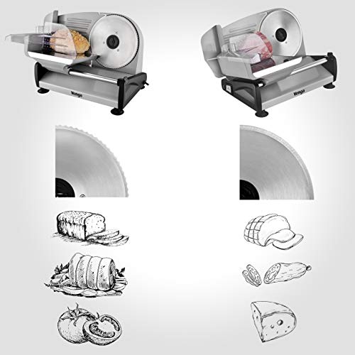 2 MESSER: Sehr robustes Wellenschliffmesser aus Edelstahl mit einem großen Durchmesser von 19 cm für größere Vielseitigkeit. Das mit einer Verriegelungsfunktion ausgestattete Messer ist zur einfachen und gründlichen Reinigung abnehmbar. Dazu zusätzlich ein Glattschliffmesser aus rostfreiem Stahl mit einem großen Durchmesser von 19 cm. Das Wellenschliffmesser ist ideal zum Schneiden von festen oder robusten Lebensmitteln, wie Brot, Braten oder festem Obst mit harter Schale, und die glatte Klinge ist zum präzisen Schneiden von Carpaccios, Aufschnitt, Gemüse, Käse usw. geeignet. Die beiden Messer sind abnehmbar und damit auch einfach und hygien