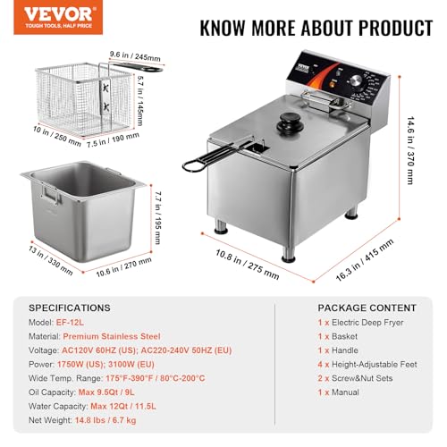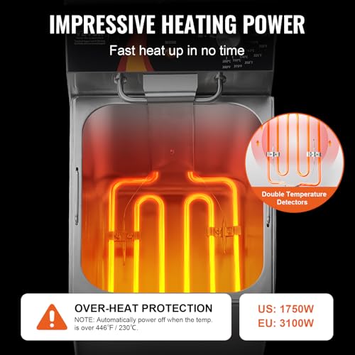 Temperaturregelung: Sie können die Temperatur leer einfach von 80 bis 200 °C (175 °F bis 390 °F) adjustieren. Egal, was passiert, Sie sind bereit, es heiß zu machen! Diese Fritteuse schaltet sich automatisch ab, wenn die Temperatur über 230 °C (446 °F) liegt oder der Temperaturregler ausfällt.