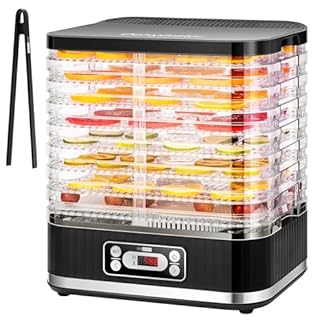 Exakt Bedienung: Stellen Sie Zeit und Temperatur ganz einfach über ein digitales Bedienfeld ein. Sie können die Temperatur von niedrig auf hoch (35 °C bis 70 °C) adjustieren und den Timer (1–72 Stunden) für Exakt Dörrdauern adjustieren. Ein Heißluftventilator schaltet sich automatisch ein und aus, um die Temperatur auszugleichen