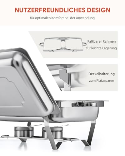 Platzsparend und stapelbar: Dieses vielseitige Buffet-Essenswärmer-Set lässt sich aufgrund der klappbaren Beine und stapelbaren Pfannen bei Nichtgebrauch platzsparend verstauen und einfach ausrichten und transportieren.