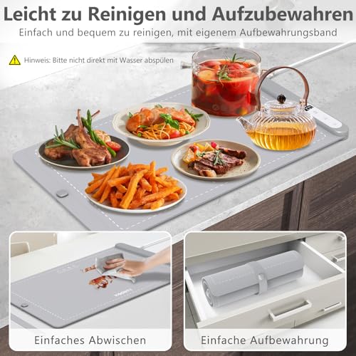 Leicht zu Reinigen und zu Warten: Speisenwärmer elektrisch besteht jeglicher hochwertigem Silikonmaterial in Lebensmittelqualität, das eine ausgezeichnete Temperaturbeständigkeit und Haltbarkeit aufweist. Spritzwassergeschützt, schmutzabweisend und ölbeständig und die Oberfläche ist leicht zu reinigen, Ölflecken müssen hingegen mit einem feuchten Tuch abgewischt werden. Genießen Sie die Vorteile eines funktionalen, kompakten und leicht zu verstauenden Warmhaltebretts.